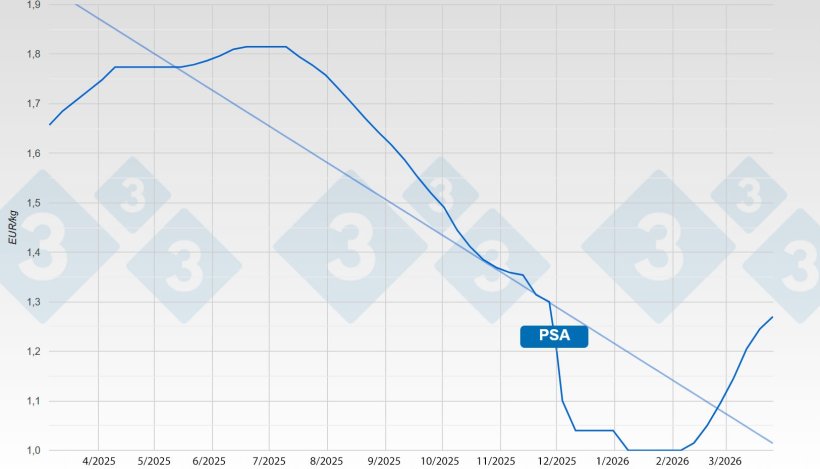 La peste suina africana (PSA) ha fatto crollare il prezzo del suino in Spagna a 1,00 € al chilo di peso vivo, ben al di sotto del costo di produzione. In pochi giorni il prezzo è calato di 30 centesimi. Da giovedì 12 febbraio, il prezzo del suino in Spagna ha subito un'innegabile impennata: in 7 settimane, il prezzo del suino spagnolo è aumentato di 27 centesimi al chilo di peso vivo. Si è trattato di aumenti rapidi e decisivi che ora stanno gradualmente rallentando.