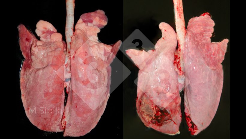 La pleurite si riferisce all'infiammazione della sierosa pleurica. Quando questa lesione è limitata ai lobi dorso-caudali, altamente compatibile con un'infezione da Actinobacillus pleuropneumoniae (Figura 2). I casi cronici (quelli che solitamente si presentano al macello) sono caratterizzati da aderenze fibrose alla pleura viscerale e parietale. In questi casi, le aderenze del tessuto polmonare sono frequenti e lasciano parte dell'organo attaccato alla parete toracica durante la rimozione del polmone dalla carcassa, che può portare al sequestro. In questo scenario, la presenza di queste aderenze polmonari sarebbe indicativa di un'elevata gravità della lesione.