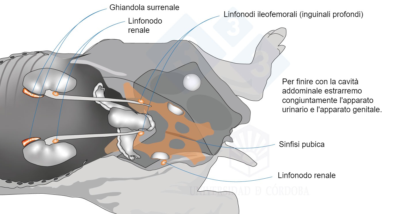 Rimuoveremo la milza, legheremo e taglieremo il retto prima dell'ingresso nella pelvi (nel capitolo precedente abbiamo già legato l'esofago). Questo ci permetterà di estrarre lo stomaco, le anse intestinali e il pancreas senza perdita del contenuto intestinale. Una volta estratti osserveremo i linfonodi mesenterici.