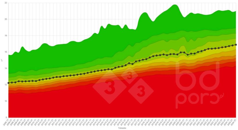 Grafico 1: Evoluzione del totale dei nati per figliata nel database BDporc dal 2008 al 2024. Sono rappresentati la media e i diversi percentili.. Vedere la sezione Comparatore dei dati riproduttivi sulla 3tre3.