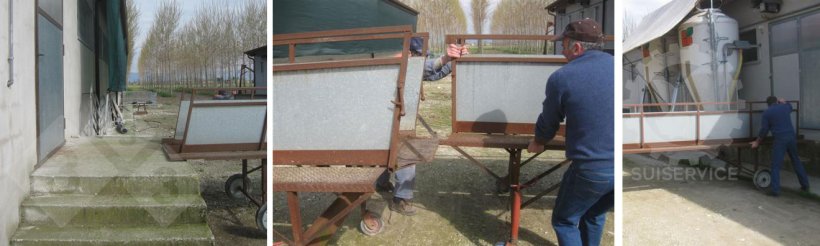Tralasciando ad altro appuntamento lo spostamento dei suinetti, ci occupiamo qui dello spostamento delle scrofe tra il capannone inseminazione-gravidanza e quello delle sale parto. Molti sono i sistemi adottati nei vari allevamenti (e ne vedremo alcuni…) ma questo, in particolare, riguarda due capannoni distinti che hanno il piano di calpestio “fuori terra”.