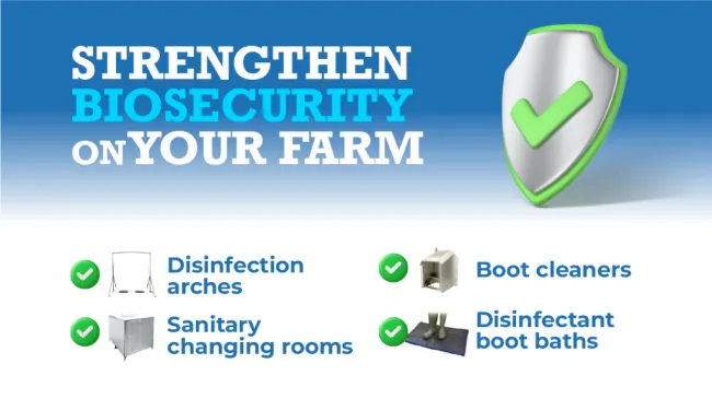 - Facilities and equipment: disinfection arches, sanitary changing rooms, footbaths, carcass containers and veterinary waste containers