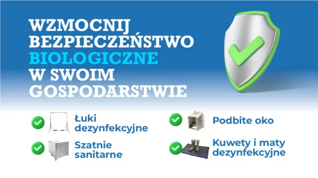 - Obiekty i sprzęt: łuki dezynfekcyjne, przebieralnie sanitarne, wanny, pojemniki na zwłoki i odpady weterynaryjne