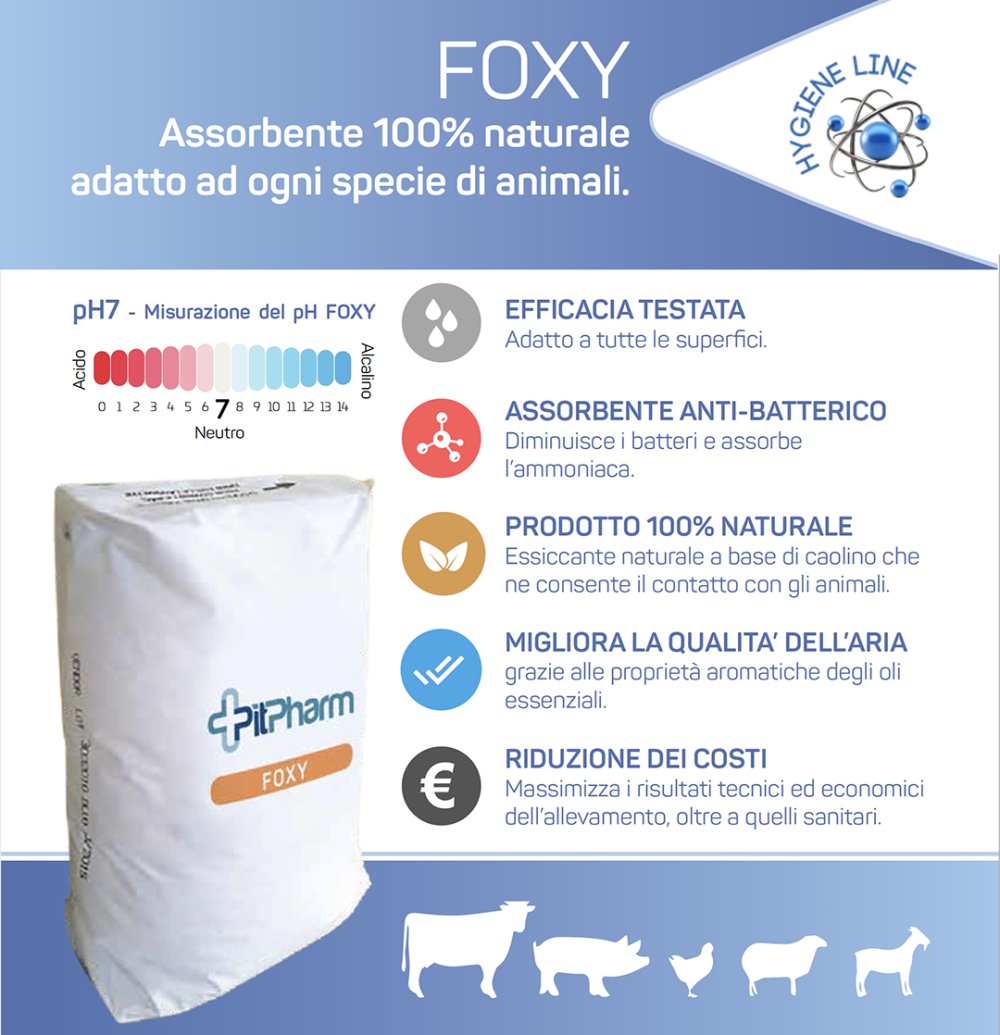 FOXY è un innovativo assorbente naturale misto caolino-vegetale che asciuga e igienizza tutti i tipi di superfici in allevamento. Combatte la diffusione di batteri patogeni grazie al sale inorganico, migliorando notevolmente le condizioni di allevamento e il comfort degli animali. FOXY aiuta a mantenere le superfici pulite e asciutte, valorizzando al contempo lettiera e liquame.
