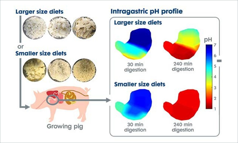 Le diete più grossolane determinano stomaci più pesanti, con una maggiore capacità di produzione di acido. Questo favorisce non solo la digestione dei nutrienti, ma anche la formazione di un gradiente di pH sano all'interno dello stomaco. Al contrario, le diete finemente macinate o pellettate possono portare a un pH uniformemente basso in tutto lo stomaco, il che è stato associato allo sviluppo di ulcere gastriche, anche in suinetti giovani e clinicamente sani.