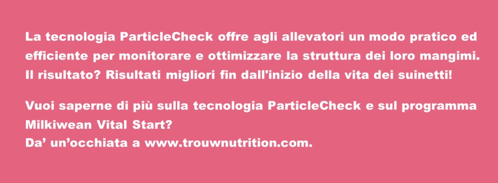 La granulometria gioca un ruolo cruciale nella nutrizione e nella salute dei suinetti, in particolare durante il delicato periodo post-svezzamento. Un problema chiave in questa fase è la comparsa di diarrea, spesso scatenata da un'alimentazione eccessiva subito dopo lo svezzamento. Questa sovralimentazione può essere dovuta a una preparazione inadeguata all'assunzione di mangime secco prima dello svezzamento, ma in genere si verifica anche in suinetti di specifiche linee genetiche. Recenti prove sul campo condotte da Trouw Nutrition dimostrano che diete ben strutturate contribuiscono a migliorare significativamente l’assunzione di mangime, il che si traduce in un migliore sviluppo dell'intestino e dello stomaco nei suinetti in fase di svezzamento.