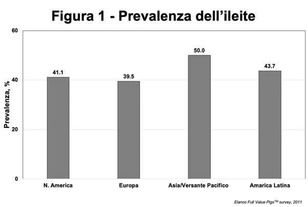 ”L’ileite rappresenta una sfida molto diffusa (vedasi Figura 1) solitamente la soluzione consiste nella vaccinazione e nell’uso di antibiotici, anche se si cerca sempre di piu`di abbandonare il ricorso a questi ultimi. L’ileite è comunemente ritenuta un problema delle fasi di accrescimento ed ingrasso, ma ora, senza uso di antibiotici si riscontrano molti casi anche in animali piu` giovani. Questo fa sì che il problema economico si aggravi: quanto più a lungo gli animali presentano malattie gastroenteriche, tanto più serie sono le conseguenze in termini di morbilità, mortalità e perdite finanziarie.”