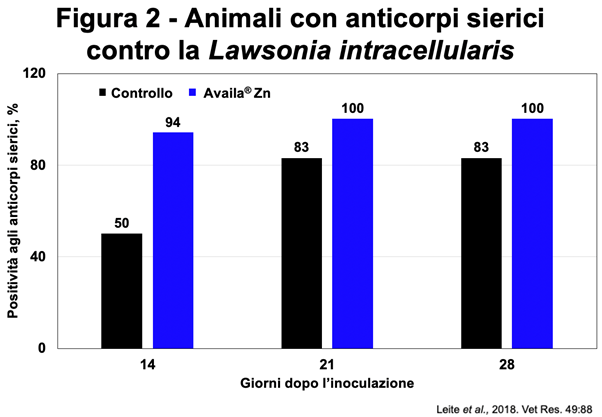 ”I maiali alimentati con una dieta integrata con Availa Zn presentano un livello più elevato di anticorpi sierici (Figura 2). Inoltre, presentano un numero notevolmente maggiore di cellule immunitarie (cellule T), le stesse che in presenza di ileite subiscono gli attacchi soppressivi.”