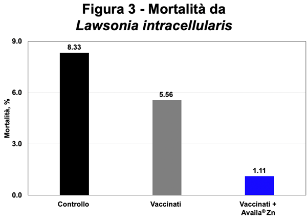 ”Nel test, gli animali vaccinati che hanno ricevuto l’Availa Zn ottengono maggiori benefici dalla vaccinazione, con una riduzione della mortalità per ileite clinica. Si nota un effetto sinergico fra vaccinazione ed integrazione, che riduce la mortalità e migliora le prestazioni complessive.”