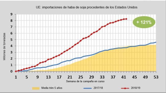 Le importazioni di semi di soia dagli Stati Uniti verso l'Unione europea sono aumentate del 121% durante l'anno in corso (da luglio 2018 a metà aprile 2019), rispetto allo stesso periodo dell'anno precedente.