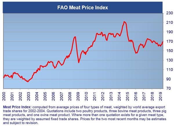 L'indice dei prezzi alimentari della FAO, che tiene traccia della variazione mensile dei prezzi internazionali delle materie prime alimentari che sono comunemente commercializzate, ha registrato in media 172,4 punti in maggio, che è un aumento dell'1,2% rispetto al mese precedente, mentre rimane ancora dell'1,9% al di sotto del livello di maggio del 2018.